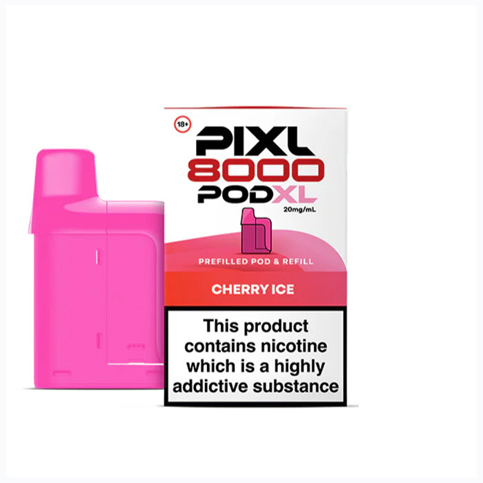 The Cherry Ice Pixl 8000 refill pack muddles a rich stone fruit flavour with frosty notes. You'll taste sweet and sharp red cherry, cooled by a chilly exhale. It’s ideal if you're after a fruity blend with an icy finish.
